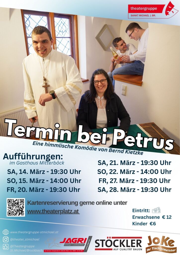In unserem neuen Theaterstück „Termin bei Petrus“ wird’s turbulent, witzig und überraschend!Freut euch auf schräge Begegnungen, himmlische Bürokratie und jede Menge Lacher.